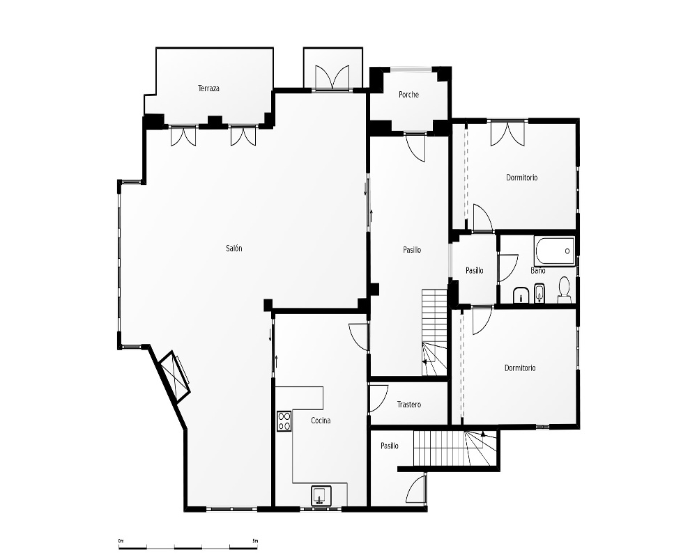 Estos interiores se diseñaron pensando en brindar una sensación de amplitud y una conexión armoniosa con el entorno exterior. Además, cuenta con porches tanto en la parte delantera como en la trasera, junto con zona ajardinada, que aportan un toque de encanto y versatilidad a la vivienda.