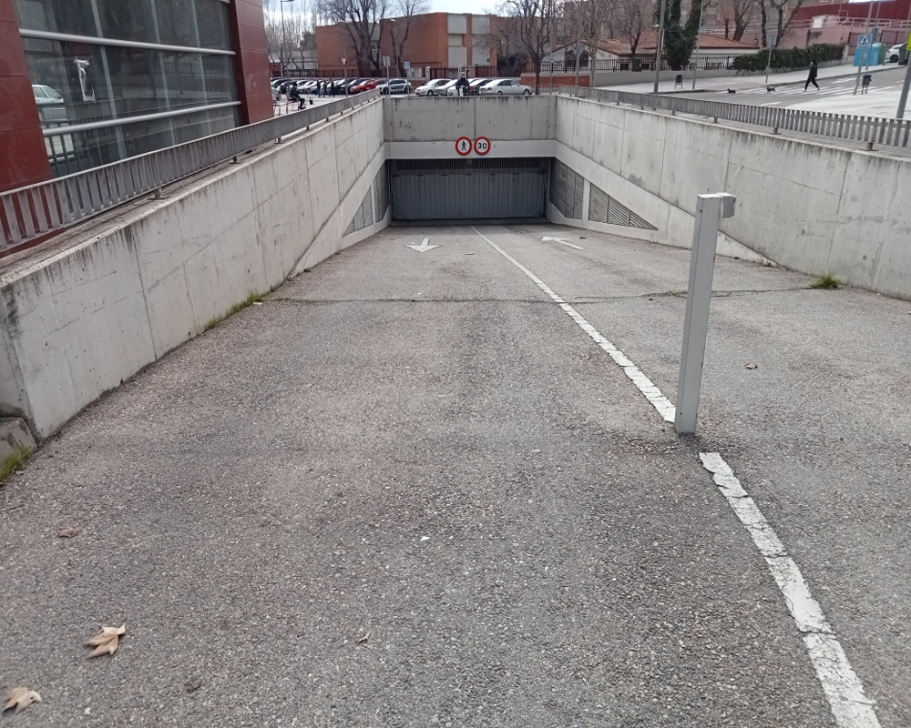Plaza de aparcamiento ubicada en las instalaciones dedicadas a ello, en las confluencias de las calles Velázquez, Greco y Pizarro de la localidad madrileña de Valdemoro. El acceso a las instalaciones se realiza a través de dos accesos en superficie, situados uno en la calle Velázquez y el otro en la calle del Greco.
