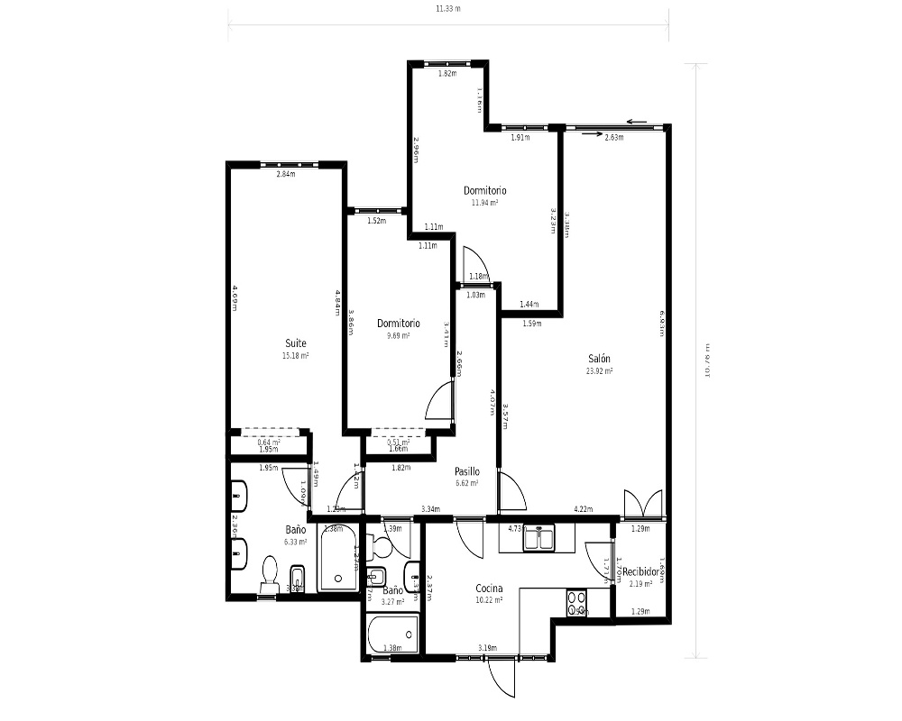 | Dispone | 3 habitaciones | 2 baños |