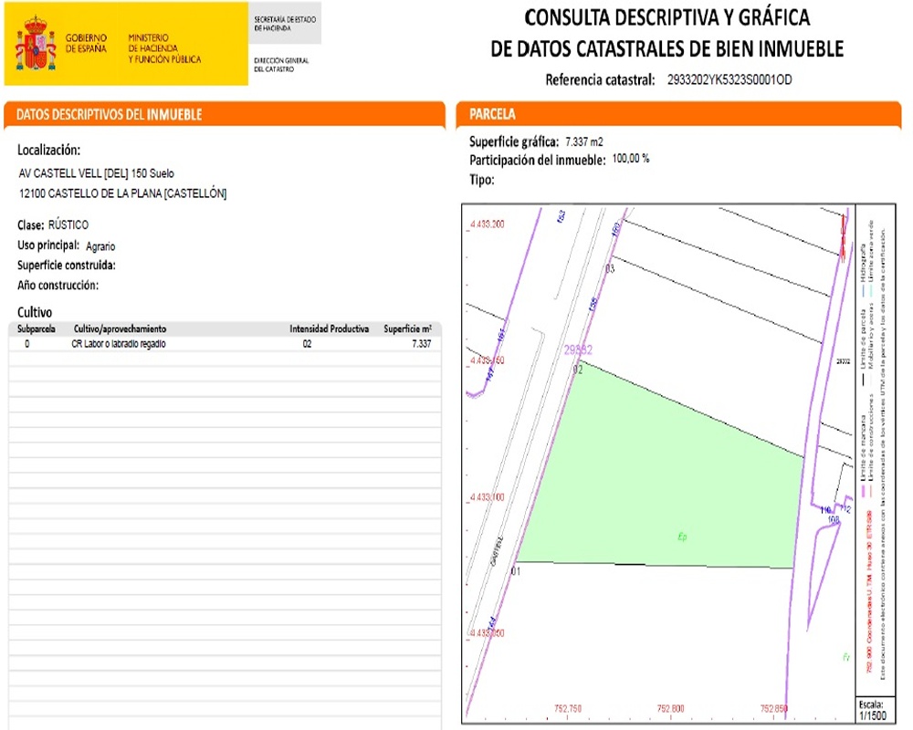 Excelente oportunidad de adquirir en propiedad esta finca rústica proindiviso en la cual somos propietario de una parte porcentual del 22,22% de un suelo que en total tiene una superficie de 7.662m² ubicado en la localidad de Castellón de la Plana, provincia de Castellón. Dispone de buenos accesos y está bien comunicado.
