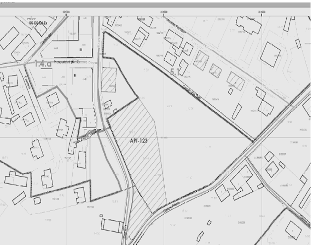 - Superficie de suelo adoptada: 10.245 m2 resultado de descontar la zona medida sobre plano que no es edificable 990 m2 y queda una superficie de 10.245 m2.